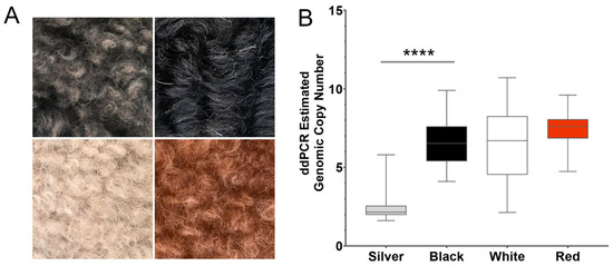 Eumelanin and pheomelanin-based Poodle coat colors and CNV genotypes. (A) Representative Poodle hair samples from eumelanin low intensity silver (top left), eumelanin high intensity black (top right), pheomelanin low intensity cream (bottom left), and pheomelanin high intensity red (bottom right). (B) Genomic copy number measured with digital droplet PCR from high and low intensity Poodles with pheomelanin and eumelanin-based coat colors. Silver compared to black was significant (p = 1.5 × 10−8) while white compared to red was not. Sample numbers from left to right are as follows: n = 27, n = 425, n = 21, and n = 29. **** = highly significant.