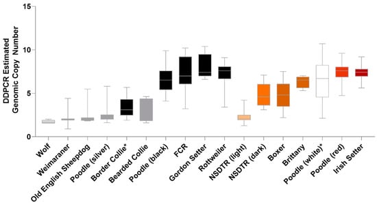 Copy number quantification of samples was performed with a digital droplet PCR (ddPCR) assay on a BioRad QX200 Droplet Digital System (BioRad, Hercules, CA, USA). Primers for the KITLG CNV were designed from the CanFam3.1 reference genome (F: GAGTAGGTGTAATTTACCGGACA, R: AGCTATTTGCACAGGCTTTTT, probe: CCCATCCATCTTTACCTTCAGAAACA) with a 5′ 6-FAM (fluorescein) dye and quenched with 3′ Zen Iowa Black dye as designed by Integrated DNA Technologies (IDT, Coralville, IA, USA). A control gene assay for ETS proto-Oncogene 1 (ETS1) was designed by BioRad with HEX (hexachloro-fluorescein) dye to a region conserved across mammalian Taxa chr5:6,166,572–6,166,747 (BioRad Assay ID: 10042961). Prior to PCR, DNA was digested with New England Biosciences AvaII restriction enzyme (Product #R0153L, NEB, Ipswich, MA, USA). The copy number was calculated using the BioRad QX200 software standard protocol as a ratio of positive KITLG droplets to positive ETS1 droplets over all accepted droplets. Sample and primer concentrations were optimized to produce single templates per droplets. Statistical analysis of the results and generation of figures was performed with GraphPad Prism Version 8 (GraphPad, San Diego, CA, USA). A Mann-Whitney test was used to evaluate the differences between dark and light coat colors in NSDTRs and Poodles.