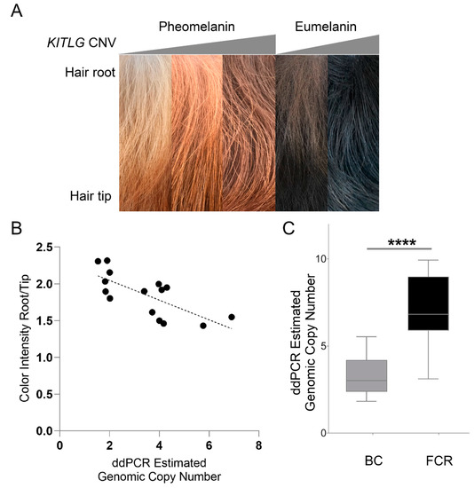 Two breeds did not fit the association of the copy number with pigment intensity. The black and white BC did not have a high copy number as expected, and white Poodles had higher copy number than expected likely due to the presence of other mutations that affect their pheomelanin intensity. Eumelanin based Poodles did have a strong correlation of copy number and color. Poodles have mutations that alter their hair length, which functions by extending the anagen phase of the hair growth cycle. This led us to hypothesize that the pigment intensity might be due to changes along the length of the hair in dog breeds with more typical anagen phase growth. Changes in the pigment color along the hair shaft were evaluated quantitatively using high-resolution photographs and compared between high and low copy number dogs. Low copy number dogs appear to have less pigmentation at the root compared to high copy number dogs (Figure 5A). Linear regression analysis of 15 NSDTR with color intensity ratios from root to tip and estimated ddPCR genomic copy number identified a significant association of the high copy number with a low ratio (p = 0.0022) (Figure 5B). Additionally, a eumelanin breed with light roots (Border Collie) had significantly lower copy number compared to uniformly pigmented Flat Coated Retrievers FCR (p = 2.3 × 10−7) (Figure 5C).