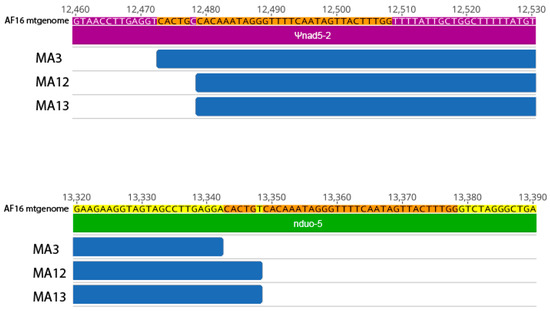Large deletions harbored by AF16 MA3, MA12, and MA13 mitochondrial genomes. Annotations and base positions are based on the reference AF16 mtgenome. The top region shows positions 12,460–12,530, which are within ψnad5-2, while the bottom region shows positions 13,320–13,390, within nduo-5. The deletion regions, referred to collectively as nad5Δ and represented in blue, are 870 bp in length and span from ψnad5-2 into nduo-5. While MA13 and MA12 share the same nad5Δ, the deletion in MA3 is shifted +6 bases. None of the AF16 MA lines had evidence for more than one nad5Δ deletion variant. The 5 bp and 30 bp direct repeat motifs flanking the deletions are shown in orange.