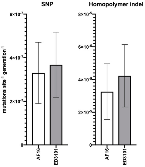 Mutation rate estimates for AF16 and ED3101 MA lines. For each isolate, mutation rates represent the combined estimate that includes their five respective MA lines. Homopolymer indel mutation rates were calculated based on only homopolymer indel variants that were found in runs ≥ 8 bp. Error bars are ± 1 standard error of the mean.