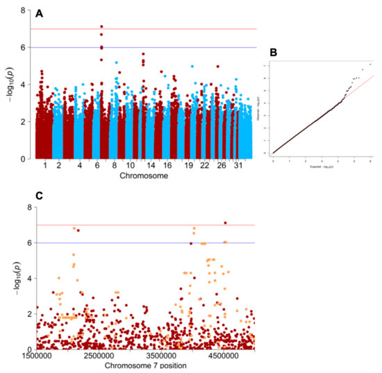- Turner, S.D. qqman: An R package for visualizing GWAS results using Q-Q and manhattan plots. Am. J. Hum. Genet. 2014. [Google Scholar] [CrossRef]