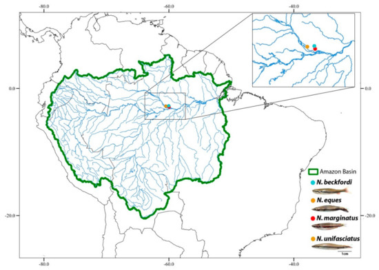 - Benzaquem, D.C.; Oliveira, C.; da Silva Batista, J.; Zuanon, J.; Porto, J.I.R. DNA barcoding in pencilfishes (Lebiasinidae: Nannostomus) reveals cryptic diversity across the brazilian Amazon. PLoS ONE 2015, 10, e0112217. [Google Scholar] [CrossRef]