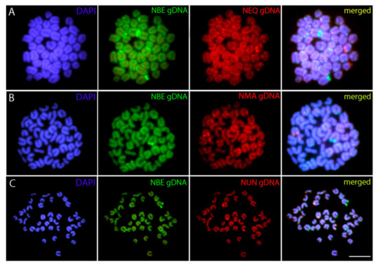 We designed a set of experiments aimed at inter-specific genomic DNA comparison among all studied Nannostomus species. For this purpose, genomic DNAs (gDNA) from males and females of all species were isolated from liver tissue using a standard phenol/chloroform/isoamyl alcohol extraction [29]. We performed a set of separate experiments, where the N. beckfordi genomic probe was co-hybridized with the gDNA of one of the remaining species under study, against the chromosome background of N. beckfordi. The probes were generated again by nick translation reaction (Roche) as described above, with a differential labeling system employing biotin-dUTP (for N. beckfordi) and digoxigenin-dUTP (for N. eques, N. marginatus, and N. unifasciatus). Besides 500 ng of each labeled probe, the final hybridization mixture also contained 10 μg of unlabeled C0t-1 DNA generated from a N. beckfordi female and 10 μg of unlabeled C0t-1 DNA from the female of the compared species, in order to outcompete the excess of shared repetitive sequences. C0t-1 DNA was prepared according to Zwick et al. [30]. The probes were precipitated with 100% ethanol and the air-dried pellets were mixed with a hybridization buffer containing 50% formamide, 10% SDS, 10% dextran sulfate, 2× SSC, and Denhardt’s buffer (pH 7.0). The hybridization process took place in a moist chamber at 37 °C for 72 h. The hybridization procedure was performed according to Sember et al. [31]. After post-hybridization washes, done twice in 50% formamide in 2× SSC, pH 7.0 (44 °C, 10 min each) and three times in 1× SSC (44 °C, 7 min each), the probes were detected using Anti-Digoxigenin-Rhodamin (Roche, Basel, Switzerland) and Avidin-FITC (Sigma, St. Louis, MO, USA). Chromosomes were then counterstained with DAPI in antifade solution, as described above.