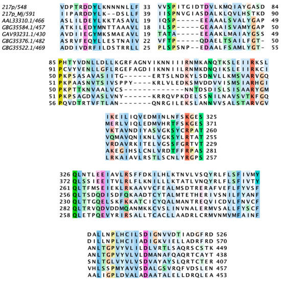 - Waterhouse, A.M.; Procter, J.B.; Martin, D.M.; Clamp, M.; Barton, G.J. Jalview Version 2—a multiple sequence alignment editor and analysis workbench. Bioinformatics 2009, 25, 1189–1191. [Google Scholar] [CrossRef]