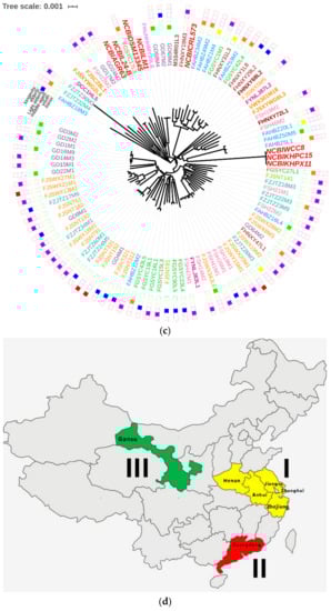 - Letunic, I.; Bork, P. Interactive tree of life (iTOL) v3: an online tool for the display and annotation of phylogenetic and other trees. Nucleic Acids Res. 2016, 44, W242–W245. [Google Scholar] [CrossRef]