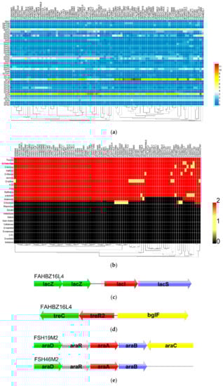 An in silico assessment of the role of specific genes associated with sugar metabolism was performed with the gene–trait matching (GTM) analysis according to the association between the presence or absence of gene families, and growth or non-growth phenotype of the 93 L. mucosae strains. The β-galactosidase belonging to the GH2 and GH42 families was responsible for the metabolism of D-galactose, D-lactose, and α-lactose. Although some strains differed in the utilization of each sugar, all the strains containing GH2 and GH42 were able to utilize these three sugars. The genotype and phenotype reached a 100% match. Further analysis of the lactose gene cluster revealed that all the strains contained intact lactose operons, involving lacS (PTS sugar transporter subunit IIA), lacZ (β-galactosidase), and lacI (LacI family transcriptional regulator) (Figure 3c).