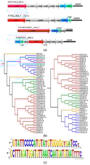 To explore the acquired immunity, the presence of the CRISPR-Cas system was investigated through in silico analyses. CRISPR was found in all those 93 genomes, and only those with higher levels of evidence were considered in the current study. On the other hand, the CRISPRs without Cas protein were ignored due to the lack of ability to silence foreign DNA. In total, 41 strains carrying 47 total CRISPR-Cas systems were identified. Among those strains, four CRISPR-Cas subtypes were found, including type IE (12 strains), type IC (three strains), type IIA (23 strains), and type IIIA (nine strains). However, the existence and subtypes of the CRISPR-Cas system seemed to have little correlation with the source of the strain. The species and locus of Cas protein in the four subtypes were predicted using CRISPRCasFinder, showing that they were identical in each subtype. Therefore, four strains were selected as representatives to display each CRISPR-Cas subtype (Figure 6a). The Cas3, Cas9, and Cas10 proteins were characteristic genes of type I, type II, and type III, respectively, which were labeled to distinguish different subtypes and were key proteins for the CRISPR-Cas system to target interference. In addition, Cas1 and Cas2 proteins were contained in each CRISPR-Cas system, which were responsible for the insertion of new spacer sequences as an important adaptive protein.