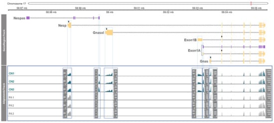 Next, expression levels of each transcript from the GNAS locus were examined by RNA-seq. To this end, the read coverage of unique exons (i.e., the non-overlapping first exons as displayed in Figure 1) from the six transcripts was compared. The height and coverage of bars displayed accumulated numbers of reads spanning the indicated exons of each transcript (Figure 2). As visualized, there were three patterns: paternal expression (as the expression occurred only in CN of Nespas, Gnasxl, Exon1B, and Exon 1A), maternal expression (as the level of expression in PA with two copies of maternal alleles was approximately two-fold higher in Nesp compared to CN with one maternal allele) and biallelical expression (as the level of expression in CN and PA was equivalent in Gnas and shared 2nd–13th exons).
