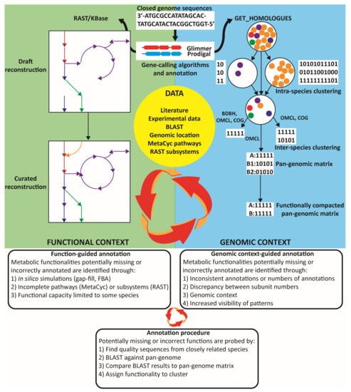 The draft reconstructions developed were of low quality, containing numerous incorrect annotations and lacking key central carbon metabolic reactions including reactions of the Wood–Werkman cycle, highlighting the shortcomings of utilizing popular automated annotation pipelines for non-model organisms. A combined pan-genomic guided annotation approach was used to functionally correct the annotations by incorporating functional information contained within the models, pan-genomic information, and available data, and it is summarized in Figure 1. Briefly, the metabolic models gave functional cues to guide the annotation, such as gap fills, blocked reactions, differing metabolic capabilities between organisms, or testing catabolic capacity for experimentally verified nutrient sources, including phenotype array information. Metabolism was explored on a pathway basis using the pathways defined in MetaCyc [] or subsystems from RAST to guide the search for potentially missing functionalities. Functional cues also come from the literature, which contains strain-specific information for certain genes and enzymatic capabilities. Another primary source of annotation cues comes from the genomic context of the orthologous and functional matrices. The genomic context benefits the annotation by enhancing resolution and allows the identification of inconsistent annotations, as well as potentially missed or incorrect annotations when they are present or absent in a small number of species, and it provides additional evidence for an annotation, such as if a function is flanked by genetic elements with related functions in some strains or highly conserved genomic regions. Analysis of the functional orthologous matrix allows the identification of reactions that were not captured in the draft models due to pipeline limitations and helps identify incorrect annotations such as inconsistent numbers of subunits of a particular complex. Then, potentially absent or incorrectly annotated genes were probed by identifying sequences from closely related strains and by using BLAST to compare these sequences against a local database. This database contained all modeled Propionibacterium protein sequences and genomes and could be used to query the propionibacteria pan-proteome or look for unannotated sequences in the pan-genome. Then, results are validated against orthologous gene clusters, and functionality is assigned on a cluster basis.