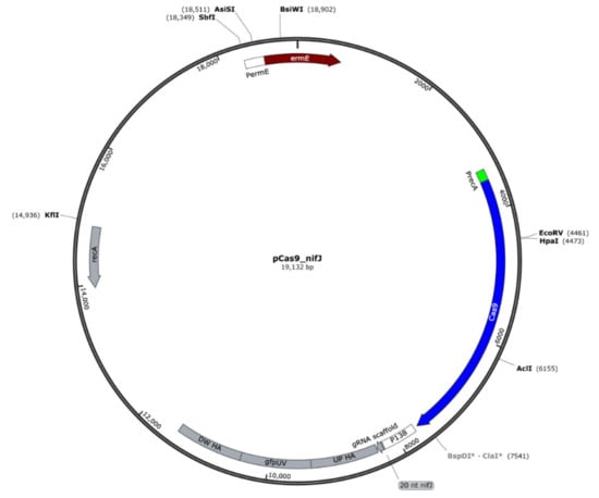 The pyruvate:ferredoxin oxidoreductase (PFOR) encoded in nifJ1 gene (PFREUD_RS00925, CDS.199 this study) was knocked out in P. freudenreichii using CRISPR/Cas9 by interruption of the gene with gfpUV. Briefly, we assembled plasmid pPAC_Cas9 using pRGO1 as the plasmid backbone and introducing the lacZ-MCS region, an erythromycin resistance gene (ermE), and a GC-optimized Cas9 under the control of promoter PermE. Then, Gibson assembly was used to create the knockout vector, pCas9_nifJ (Figure 2), by adding homologous arms designed to span 1 kb up and downstream of a PAM region identified in the nifJ gene, the gfpUV sequence, and gRNA under the control of the P130 promoter from propionibacteria. The homologous arms and gfpUV were PCR amplified from P. freudenreichii and the pBRPprp_gfpuv plasmid respectively. Primer sequences and the 20-nt region for the gRNA are shown in Table 2. All cloning was performed in E. coli DH5α (Bioline). PCR reactions were performed using Phusion Taq (NEB). Introduction of plasmid pCas9_nifJ into P. freudenreichii was performed by electroporation as previously described []. After 3 h recovery on PAM media with 40 g/L sucrose, cells were plated on NLB (sodium lactate, 10 g/L; trypticase soy, 10 g/L; yeast extract, 10 g/L; glucose, 10 g/L) agar and incubated in an anaerobic jar at 30 °C. After 10 days, colonies were identified and tested by colony PCR to confirm the successful knockout. Positive ∆nifJ colonies were then grown on NLB liquid media for 72 h.