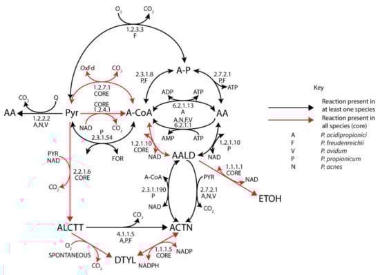 Acetate, acetoin, and ethanol metabolism of Propionibacterium. (Black) arrows represent reactions present in at least one species. (Red) arrows represent reaction in all species (core).