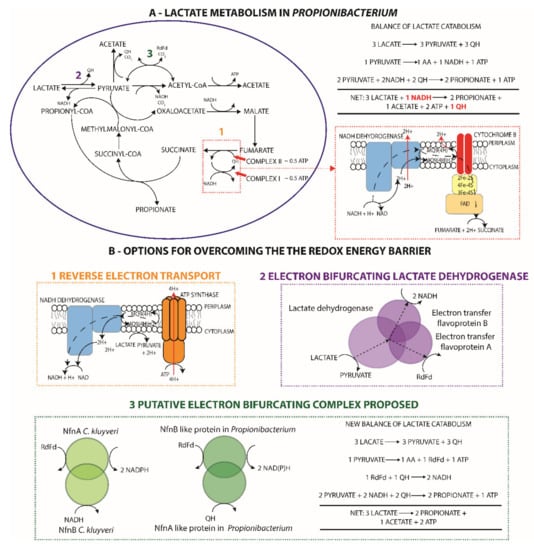 Despite the extensive study of lactate fermentation by propionibacteria, no attention has been given to the energetic challenge of anaerobic lactate catabolism originally highlighted in 1973 []. Three lactate molecules are fermented to form two propionate and one acetate molecule [,] in accordance with the redox balance. However, this necessitates an energetically unfavorable reduction of NAD by a quinol; three lactate molecules are oxidized to pyruvate, generating three quinols, two pyruvate molecules are reduced to two propionate molecules requiring two NADH, and two quinols (in the absence of the NADH dehydrogenase), and the remaining pyruvate is oxidized to acetate with the generation of a quinol, NADH, or ferredoxin, as previously discussed (Figure 4A).