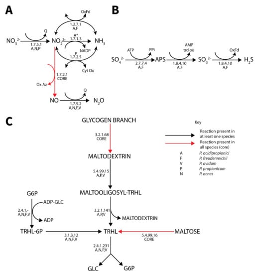 Diagrams of the pan-genomic nitrate (A), sulfate (B) and trehalose (C) metabolism in Propionibacterium. (Black) arrows represent reactions present in at least one species. (Red) arrows represent reaction in all species (core). *Enzyme is present in both P. acidipropionici strains but 4875 has a frameshift mutation likely rendering the enzyme non-functional.
