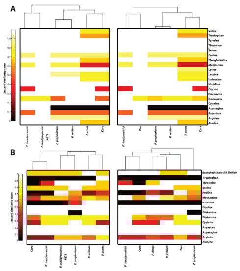 The ability for strains to synthesize and degrade amino acids will have an influence on the redox balance of the cell and consequently, the fermentation products. Differences in the metabolic potential for amino acid synthesis or degradation between strains were quantified using the Jaccard similarity coefficient and visualized as clustergrams (Figure 6). Examination of the biosynthetic pathways reveals distinct clustering of commensal and dairy bacteria. Interestingly, commensal organisms were found to have reduced diversity in their biosynthetic pathways and a wider range of degradative capabilities, particularly in comparison to P. freudenreichii. These findings likely reflect the greater reliance of proteolytic activity as a source of carbon and energy among commensal propionibacteria given their nutrient-scarce microenvironment []. Although representative species for all four genera that compose the former Propionibacterium genus were considered in this analysis, the analysis needs to be expanded further to encompass newly available sequenced species [,,] before it can be generalized more broadly. Only P. acnes was detected as auxotrophic for some amino acids.
