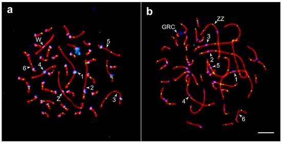 Synaptonemal complexes (SC) spreads of the oocyte (a) and spermatocyte (b) of the barn swallow after immunolocalization of the lateral elements of the SC (SYCP3—red signal), recombination nodules (MLH1—green), and centromeres (ANA-C—blue). Numbers indicate SCs of the macrochromosomes, letters—ZZ, ZW, and GRC. Bar—5 µm.