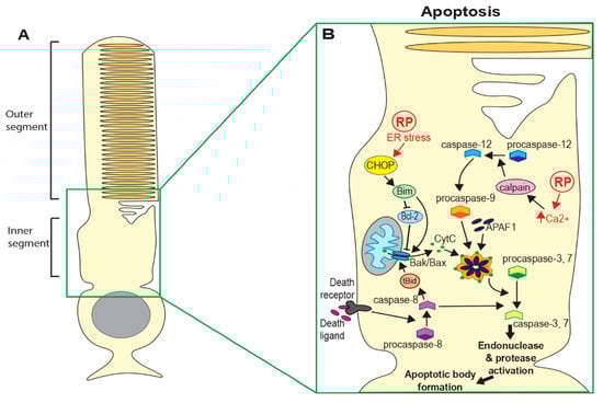 RP can be inherited in an autosomal dominant, autosomal recessive, X-linked or mitochondrial manner and can be either syndromic or non-syndromic [2,3]. Genes have been identified that are involved in phototransduction, cell trafficking and rhodopsin recycling pathways [3,4,5]. However, despite knowledge of how these mutations disrupt photoreceptor function, the precise mechanisms that lead to photoreceptor death are still not well understood. Given the extremely heterogeneous nature of RP, identifying and understanding common cell death mechanisms is vital if we are to develop treatments applicable to all disease-causing alleles. This review brings together some of the recent work to identify cell death pathways involved in RP and the mechanisms that link causative mutations to initiation of these pathways.