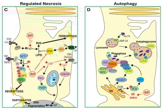 Necroptosis is regulated by the interaction between two receptor interacting protein kinases (RIP1 and RIP3) [17,18]. This complex activates phosphorylation and oligomerisation of mixed lineage kinase domain-like protein (MLKL) and these oligomers form membrane pores, resulting in the loss of cell membrane integrity (Figure 1C) [19]. Initiation of this process can occur by activation of cell death receptors, toll-like receptors, interferons or DNA damage sensors. Necroptosis has been implicated in both rod and cone degeneration in animal models of RP in several recent studies [14,20,21,22], discussed further below.
