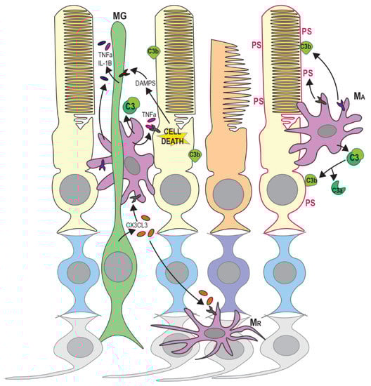 Microglia have an active role in photoreceptor death in RP. DAMPS released by apoptotic or necrotic photoreceptors trigger the release of inflammatory factors and cytokines from Müller glia (MG). Activated MG increase the expression and secretion of CX3CL3, leading to the activation of resting microglia (MR). Activated microglia (MA) secrete complement components including C3, which is cleaved to C3b on damaged or dying photoreceptors, marking these cells for phagocytosis. Stressed/damaged photoreceptors also expose phosphatidylserine (PS) on the outer surface of the cell membrane and this is also recognised by phagocytic receptors on activated microglia. The further release of inflammatory factors from MA and MG induces apoptotic or necroptotic cell death in nearby photoreceptors. These processes affect rods (yellow) more than cones (orange) in early disease stages.