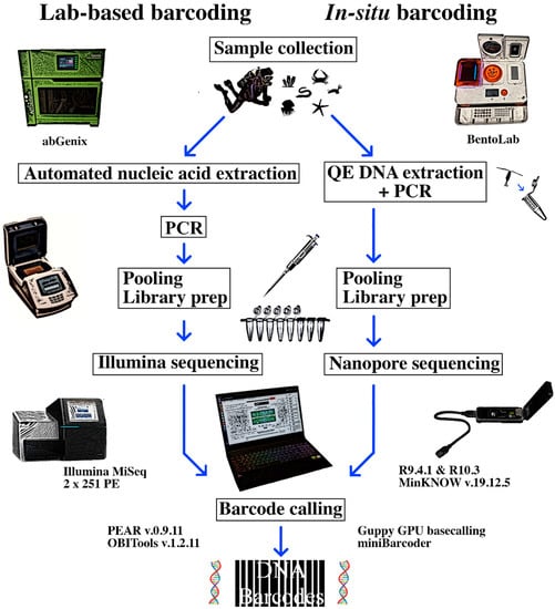 In this study, we assembled an in situ sequencing setup that comprised three main components: the suitcase-sized laboratory in the form of the BentoLab, the MinION handheld sequencer, and a laptop computer (Figure 1). Our proposed in situ sequencing workflow employed QE solution for thermal-based DNA extraction and tagged PCR on the BentoLab, before sequencing on the MinION and laptop. The laptop computer also served as an analysis terminal for basecalling and MinION barcode calling via miniBarcoder. We first tested all the protocols back at the laboratory, before conducting an in situ demonstration onboard a diving vessel moored at the Sisters’ Islands Marine Park, Singapore, on 15 July 2020 (Figure 2). We obtained 105 MinION barcodes, of which 19 were from samples obtained in the field. To our knowledge, the 31 samples and 19 DNA barcodes generated here represent one of the highest throughputs from published studies to date [,,,], with the entire sample-to-sequence workflow completed in under 9 h. In the following, we discuss our experiences with portable sequencing on the BentoLab and MinION in the form of three takeaways learnt from the entire process.