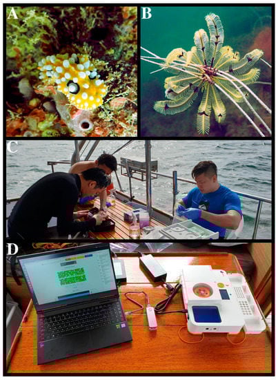 DNA barcoding performed in situ at Sisters’ Islands Marine Park, Singapore on 15 July 2020. Examples of samples collected via SCUBA: (A) HS0171, Phyllidia ocellata; (B) HS0179, Cenometra bella. (C) Samples were processed onboard and (D) barcoded using the BentoLab and MinION.