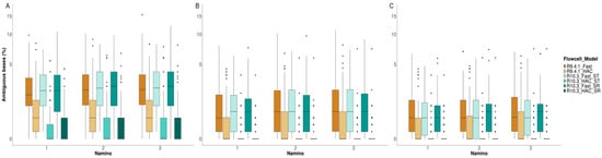 Percentage of ambiguous bases (%) for the three types of error-corrected MinION barcodes: (A) MAFFT + AA, (B) RACON + AA, and (C) consolidated. Colors represent the type of flow cell used (R9.4.1 or R10.3), along with the basecalling model applied (Fast or HAC). For the R10.3 datasets, we generated a subset for the same sequencing time (ST) as R9.4.1, and another dataset for the same number of reads (SR) as R9.4.1. Note that the y-axis was scaled using pseudo-log2 transformation for better representation.
