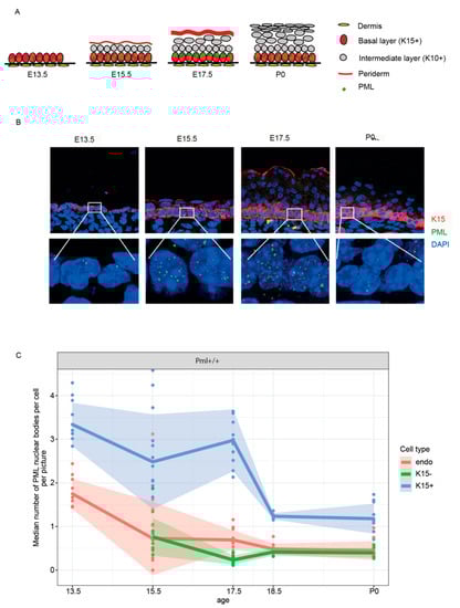 We next investigated the subcellular localization and tissue scale distribution of PML in epidermal tissue. For these experiments we carried out co-immunostaining using antibodies against K15, which is a marker of basal epidermal cells, in combination with antibodies against PML. In the embryonic tissue, we detected PML bodies primarily in basal epidermal cells, while K15 negative suprabasal cells as well as neighboring endothelial cells (directly underneath the epidermal cell layers) were found to contain significantly fewer PML bodies per nucleus (Figure 3A–C). Notably, the number of PML bodies in basal epidermal cells was observed to be significantly higher during epidermal stratification at E13.5, E15.5, and E17.5, compared to fully developed epidermis at E18.5 and postnatal stage (P0) (Figure 3B,C).