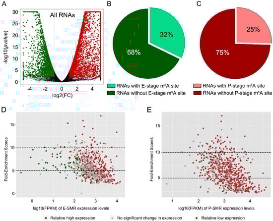 None-correlation between fold enrichment of MeRIP sequencing and reads of transcriptome sequencing. (A) The Volcano map of transcription profiles of all RNAs in P-stage compared to E-stage. The transcriptome data were downloaded and used from (NCIB GEO: GSE116056). (B) The proportion of down-regulated RNAs with or without an E-stage m6A site. (C) The proportion of up-regulated RNAs with or without a P-stage m6A site. (D,E) The correlation analysis of embryonic stage-specifically methylated RNAs (E-SMRs) or postnatal stage-specifically methylated RNAs (P-SMRs) between their fold enrichment score values of m6A-methylation levels and the FPKM reads of their expression levels.