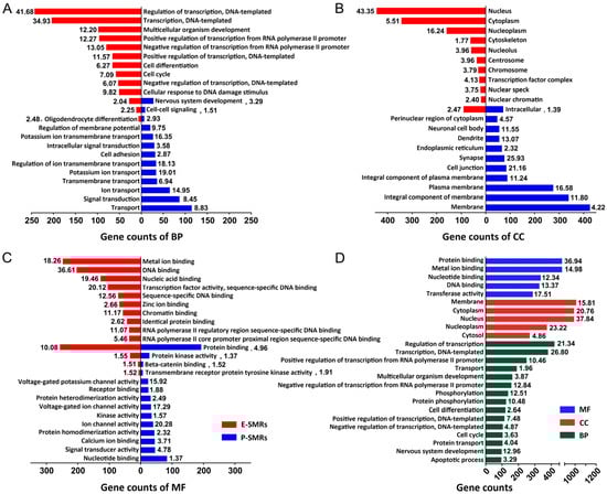 We found that m6A binding sites show enrichment in the NSC and 3′UTR regions, and within these regions, more m6A binding sites are detected in RNAs from P-stage than those from E-stage cortices (Figure 3B). Therefore, we focused the remaining analyses on RNAs with enriched m6A binding sites in the NSC and 3′UTR regions. We first performed a gene ontology (GO) analysis on E-SMRs and P-SMRs (Figure 4A, Supplementary Table S2). The top categories of biological process (BP) for E-SMRs were mainly involved in regulation of transcription, cell differentiation and cell cycle, while they were associated with ion transport, signal transduction and cell adhesion for P-SMRs (Figure 4A). Interestingly, three common categories of nervous system development, cell-cell signaling and oligodendrocyte differentiation were identified in both E-SMRs and P-SMRs (Figure 4A).