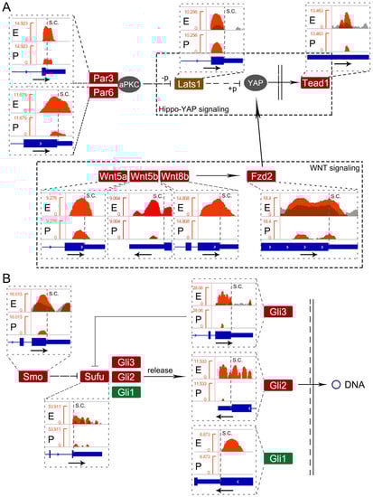 Status of m6A-methylation in genes in the hippo-YAP pathway and hedgehog pathway. (A) Integrative Genomics Viewer (IGV) analysis of four E-SMRs (Par3, Par6, Lats1 and Tead1) in the hippo-YAP pathway. Four Wnt-related E-SMRs (Wnt5a/b, Wnt8b and Fzd2) participated in the hippo-YAP pathway. (B) IGV analysis of five E-SMRs (Smo, Sufu, Gli1/2/3) in the hedgehog pathway.