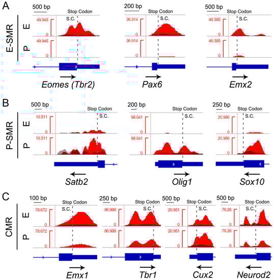 Status of m6A-methylation in cortical transcription factors. (A) Integrative Genomics Viewer (IGV) analysis of three E-SMRs that function as transcription factors (Pax6, Emx2 and Tbr2). (B) IGV analysis of three P-SMRs (Satb2 Olig1 and Sox10). (C) IGV analysis of four CMRs encoding transcription factors.