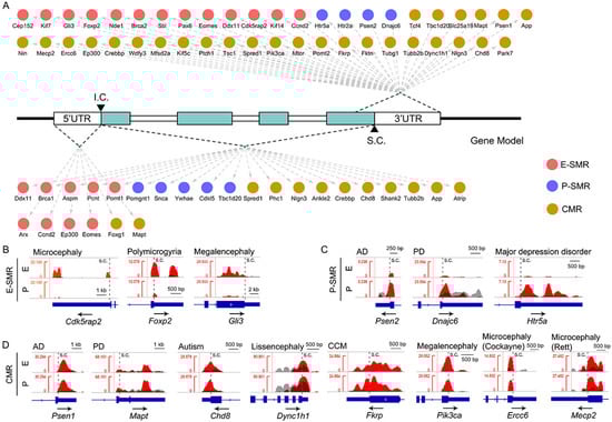 Status of m6A-methylation sites of genes in neurological disorders. (A) Identification of methylated genes and their specifically methylated patterns in RNA transcripts. The red dots stand for E-SMRs, the blue dots stand for P-SMRs, and the dark yellow dots stand for CMRs. (B) IGV analysis of three representative E-SMRs that act as pathogenetic genes (Cdk5rap2, Foxp2 and Gli3) associated with neurological disorders. (C) IGV analysis of three representative P-SMRs (Psen2, Dnajc6 and Htr5a). (D) IGV analysis of eight representative CMRs (Psen1, Mapt, Chd8, Dync1h1, Fkrp, Pik3ca, Ercc6 and Mecp2) encoding neurological disease-risk genes.