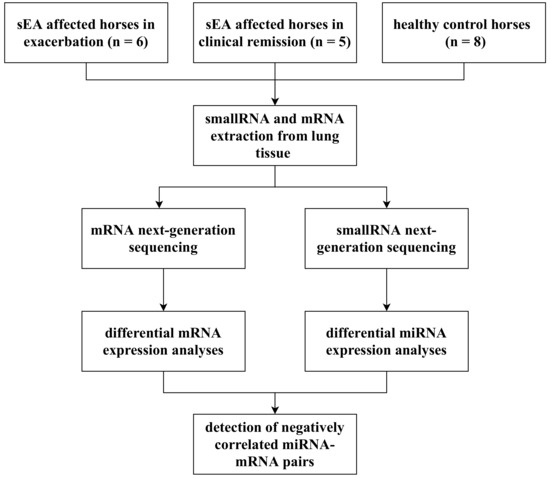 This study included eleven clinically phenotyped horses affected by sEA, of which six were in an exacerbated state and five were in clinical remission. The control group consisted of eight healthy horses. To investigate potentially dysregulated miRNA-mRNA networks underlying the pathology of sEA, we applied a comprehensive approach incorporating miRNA expression profiling and mRNA expression profiling, followed by an integrative miRNA-mRNA negative-correlation approach (Figure 1).