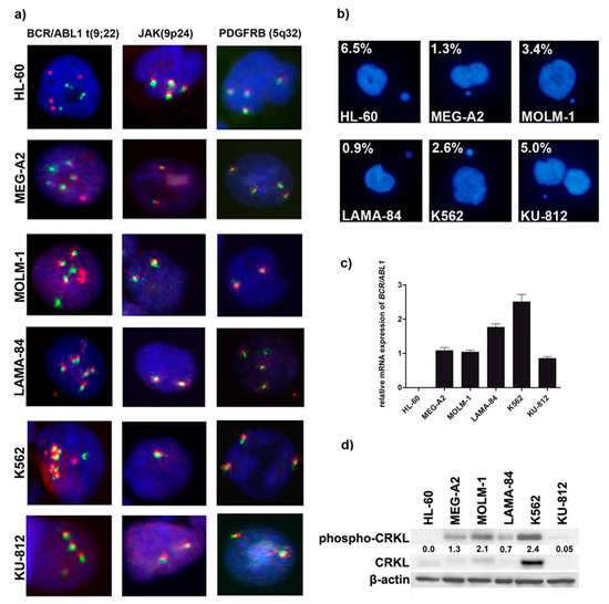 Cytogenetic and molecular features of BCR/ABL1-positive cell lines. (a) Representative images of fluorescence in situ hybridization with BCR-ABL1 t(9;22) fusion probe, JAK2 (9p24) break probe and PDGFRB (5q32) break probe. Fluorescent signals were visualized under the Olympus BX61 and MetaSystem Isis software with objective 40×; (b) Representative images and percentages of micronuclei (MN) positive cells expressed as %; (c) RT-qPCR analysis of BCR/ABL1 normalized to β2M and GUSB; (d) Assessment of BCR/ABL1 kinase activity, as determined by Western blotting analysis of phospho-CRKL. For the loading control, β-actin was used.