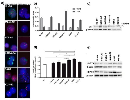 Telomere length is associated with enzymatic activity of telomerase and with expression/gene copy number of TERT/TERC in BCR/ABL1-positive cell lines. (a) Representative images of nuclei and/or metaphase plates with TERT/TERC probe. Nuclei were counterstained by DAPI. Fluorescent signals were visualized under the Olympus BX61 and MetaSystem Isis software with objective 40×; (b) RT-qPCR analysis of TERT/TERC normalized to β2M and GUSB expression; (c) Western blot analysis of TERT protein levels. For the loading control, the antibody against β-actin was used; (d) PCR-ELISA measurement of telomerase activity. The bars indicate SD, n = 2, * p < 0.05, ** p < 0.01 (ANOVA and Tukey’s a posteriori test); (e) Western blotting analysis of HSP70 and HSP90. For the loading control, β-actin was used.