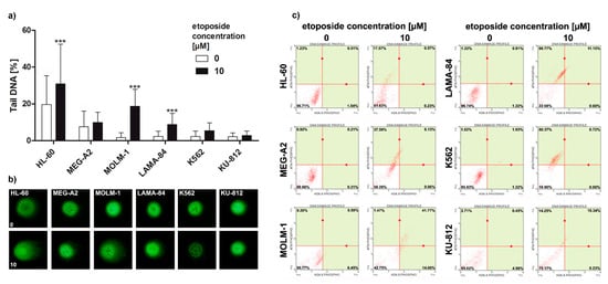 DNA damage response to double strand breaks (DSBs) in BCR/ABL1-positive cell lines. (a) Neutral comet assay analysis of DSBs. As an DSBs inducer, 24 h treatment with 10 µM etoposide was used. DNA damage marker, the % tail DNA was used. The bars indicate SD, n = 100, *** p < 0.001, compared to the control (ANOVA and Dunnett’s a posteriori test); (b) The typical images are shown. DNA was visualized using YOYO-1 staining. Images were taken using an Olympus BX61 fluorescent microscope with objective 20×; (c) phospho-ATM and phospho-H2AX were measured after 24 h treatment with etoposide using flow cytometry and Muse™ Multi-Color DNA Damage Kit.