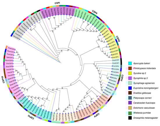 The 104 CSP genes of the 11 fig wasps are classified into seven groups, based on phylogenetic results (Figure 1). Each of the 11 fig wasps has one CSP gene in five groups (CSPI-CSPV), suggesting that these groups of genes are highly conserved and may play conserved functions in fig wasps. The homologous gene of CSPV group in the D. melanogaster, the DmelCSP3, is thought to be involved in the repair and formation of D. melanogaster tissues, which may be a target related to embryo and tissue development []. Considering that the DmelCSP2 plays a general role in tissue remodeling after injury or during development and is highly expressed during metamorphosis or in response to virus and bacteria [], we hypothesize that the 11 CSP genes in the CSPIV group closely related to the DmelCSP2 and DmelCSP1 may have similar functions.