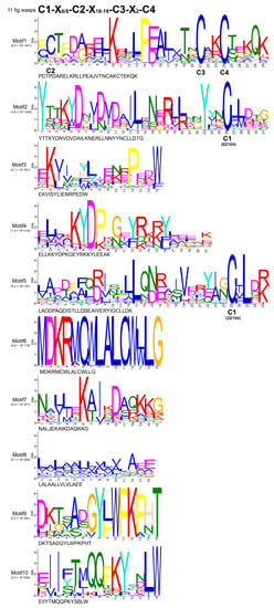 The result of the multiple sequences alignment is shown in Supplementary Materials Figure S1. Four conserved cysteine residues were present in the expected positions. WebLogo online website was further used to generate the relative frequency of multiple amino acids at each position. The first conserved cysteine was at position 223, the second at 232, the third at 252 and the fourth at 255. The four-cysteine patterns (C1-X6/8-C2-X18-19-C3-X2-C4) in the 11 fig wasps were similar to the CSP gene patterns identified in other insects []. Adjacent cysteines among the four cysteine residues were connected to form two disulfide bonds (C1-X6/8-C2 and C3-X2-C4). The highly conserved sequences indicate that the CSP genes may play conserved roles in fig wasps.