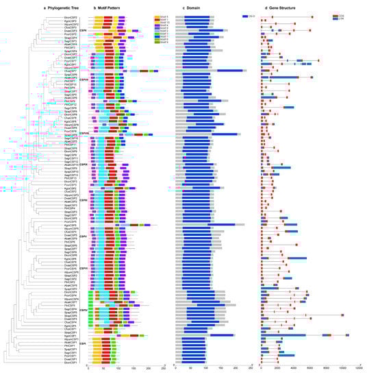 3.4. Comprehensive Analyses of the Gene Tree, Conserved Motifs, Domains and Gene Structures of the CSP Genes