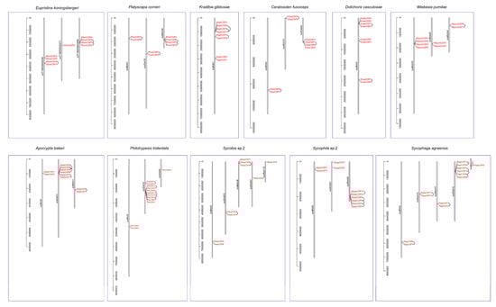 The distribution and tandem analysis of 104 CSP genes on the corresponding genomes’ scaffolds were further analyzed (Figure 4). In E. koningsbergeri, EkonCSP6 and EkonCSP1 were a pair of tandem repeat genes, distributing in scf7180000020258, and EkonCSP8, 7 and 2 were a group of three tandem duplicated genes, distributing in scf7180000023666. In P. corneri, two pairs of tandem repeat genes (PcorCSP1 and 6; and PcorCSP3 and 5) were distributed in scaffold3 and 18, respectively, and PcorCSP8, 7 and 2 were a group of three tandem duplicated genes, distributing in scaffold36. In K. gibbosae, a pair of tandem repeat genes (KgibCSP2 and 5) and a group of three tandem duplicated genes (KgibCSP8, 3 and 7) were distributed in scaffold1. In C. fusciceps, three pairs of tandem repeat genes (CfusCSP6 and 1; CfusCSP2 and 5; and CfusCSP7 and 8) were distributed in scaffold4, 10 and 22, respectively. In D. vasculosae, two pairs of tandem repeat genes (DvasCSP7 and 3; and DvasCSP1 and 6) were distributed in scaffold1. In W. pumilae, a pair of tandem repeat genes (WpumCSP6 and 1) were distributed in scaffold44. In A. bakeri, a pair of tandem repeat genes (AbakCSP7 and 10) and a group of four tandem duplicated genes (AbakCSP4, 5, 3 and 6) were distributed in scaffold12, and AbakCSP8 and AbakCSP1 were a pair of tandem repeat genes, distributing in scaffold14. In P. tridentata, two pairs of tandem repeat genes (PtriCSP1 and 2; and PtriCSP13 and 5) and a group of five tandem duplicated genes (PtriCSP9, 11, 10, 7 and 3) were distributed in scaffold16. In Sycobia sp.2, two pairs of tandem repeat genes (SbspCSP2 and 1; and SbspCSP5 and 9) were distributed in scaffold12 and 36, respectively. In Sycophila sp.2, a pair of tandem repeat genes (SpspCSP10 and 5) and a group of four tandem duplicated genes (SpspCSP8, 9, 6 and 4) were distributed in scaffold36. In S. agraensis, three pairs of tandem repeat genes (SagrCSP8 and 7; SagrCSP11 and 12; and SagrCSP1 and 2) were distributed in scaffold2, 10 and 14, respectively, and a pair of tandem repeat genes (SagrCSP13 and 4) and a group of four tandem duplicated genes (SagrCSP6, 10, 5 and 9) were distributed in scaffold15.