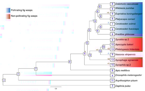 - Xiao, J.H.; Yue, Z.; Jia, L.Y.; Yang, X.H.; Niu, L.H.; Wang, Z.; Zhang, P.; Sun, B.F.; He, S.M.; Li, Z.; et al. Obligate mutualism within a host drives the extreme specialization of a fig wasp genome. Genome Biol. 2013, 14, R141. [Google Scholar] [CrossRef]