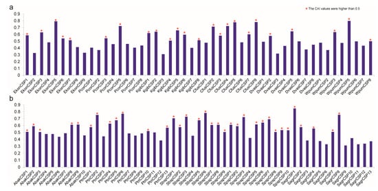 The codon adaptation index (CAI) values of 104 CSP genes in the 11 fig wasps. The red asterisks represent the CSP genes whose CAI values are higher than 0.5. (a) The CAI values of CSP genes in six pollinating fig wasps. (b) The CAI values of CSP genes in five non-pollinating fig wasps.