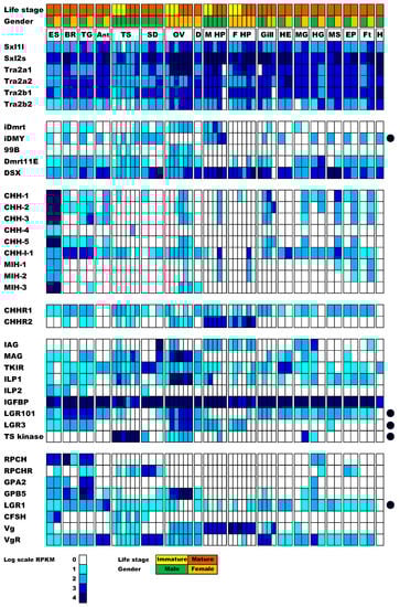 Expression of key sexual development transcripts across multiple tissues on the ornate spiny lobster Panulirus ornatus. The expression of key transcripts involved in sexual development was calculated as reads per kilobase per million reads (RPKM) in RNA-Seq libraries of multiple P. ornatus tissues. Log-transformed expression is represented by gradient color shading. Tissues from left to right: ES—eyestalk (male, female); BR—brain (male, female); TG—thoracic ganglia (male, female); AnG—antennal gland (male, female); TS—testis (3 × immature, 3 × mature males); SD—sperm duct (proximal, medial, distal); OV—ovary (3 × immature, 3 × mature females); D—oviduct; M HP—male hepatopancreas (2 × immature, 3 × mature males); F HP—female hepatopancreas (3 × immature, 3 × mature females); Gill—anterior and posterior of male, then female; HE—heart (male, female); MG—midgut (male, female); HG—hindgut (male, female); MS—tail muscle (male, female); EP—epidermis (male, female); Ft—fat tissue (male, female); H—male-derived hemocytes. Dots on the right-hand side signify transcripts further analyzed in this research.