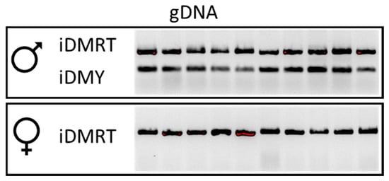 DMY is specifically found in the male genome. Using genomic DNA from males and females as a template (n = 10 per sex), PCR successfully amplified iDmrt and iDMY. A single band of expected sizes is amplified per gene, with iDmrt amplified in both males and females while iDMY is amplified strictly in males.