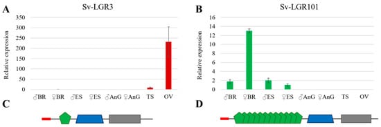 Expression and domain structure of leucine-rich repeat (LRR) G-protein-coupled receptor (GPCR) Sv-LGR3 and Sv-LGR101 in Sagmariasus verreauxi. Sv-LGR3 (A) and Sv-LGR101 (B) real-time qPCR expression analysis from S. verreauxi tissue from male and female brain (BR), eyestalk (ES), antennal gland (AnG), testis (TS), and ovary (OV). Data represent the mean ± standard error of the mean (SEM) (n = 8). Relaxin-like LRR GPCR domain structure of Sv-LGR3 (C) and Sv-LGR101 (D). The red box denotes the signal peptide, green pentagons denote the low-density lipoprotein (LDLa) extracellular repeats, the blue trapezium denotes the seven-domain transmembrane region, and the grey box represents the intracellular domain. LGR3 is a classic relaxin-type GPCR (Type C1) with one LDLa domain in the extracellular region. LGR101 is a nonclassical relaxin-type GPCR (Type C2) due to the 12 LDLa repeats in the extracellular region, making it part of the LGR101 family.