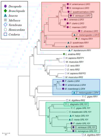 Neighbor-joining phylogram of the 7 transmembrane domains (7TMs) of dLGR3, dLGR4, and GRL101 homologs identified in eight decapod species; bootstrap values are shown at each node and were performed with 1000 replicates. The scale bar indicates number of amino-acid substitutions per site and key highlights the taxonomy. dLGR3 is boxed in red, dLGR4 is boxed in blue, and LGR101 is boxed in green, with all of the model species emphasized in boxes of corresponding colors. S. verreauxi relaxin receptor 1_LGR3 (Sv-RR1, Accession number KY427011) and G-protein coupled-receptor 101 (Sv-LGR101, Accession number KY427010) are boxed in black.
