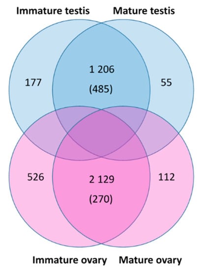 Venn diagram of differentially expressed genes between testis and ovary samples of different life stages. Comparison of immature and mature testis samples (blue) identified 177 differentially expressed genes (DEGs) enriched in the immature testis and 55 DEGs enriched in the mature testis samples. Comparison of immature and mature ovary samples (pink) identified 526 DEGs enriched in the immature ovary and 112 DEGs enriched in the mature ovary samples. Comparison of testis and ovary samples identified 1206 DEGs enriched in the testis (of which 485 transcripts are testis-specific) and 2129 DEGs enriched in the ovary (of which 270 transcripts are ovary-specific).