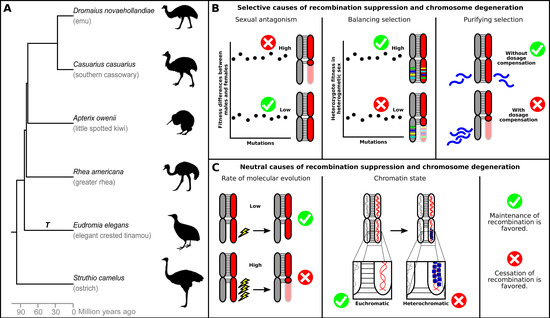 In this section, we discuss selective processes that can influence the evolution of recombination suppression and its subsequent chromosome degeneration in the context of ratite sex chromosomes (Figure 1B). These selective processes include sexually antagonistic, balancing, and purifying selection. When sexual antagonism is not prevalent or when recombination suppression is not the mechanism employed to resolve it, recombination can be maintained between the sex chromosomes. Under a specific set of conditions, balancing selection in the form of over-dominance can maintain recombination. Finally, purifying selection might hinder the degeneration process in the absence of a mechanism to equalize the amount of gene products after gene loss from the non-recombining chromosome. Below, we discuss each process in more detail.