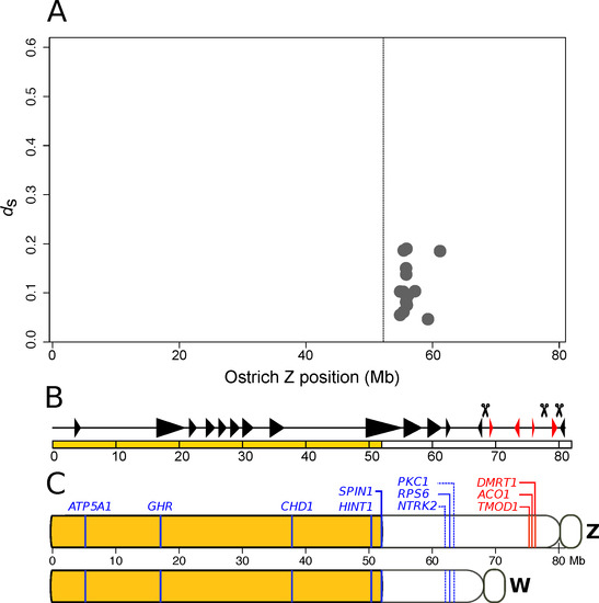 Ostrich sex chromosome evolution. (A) Level of synonymous divergence of 16 gametologous genes in ostrich. ds estimates for gametologs are obtained from [36]. The vertical line indicates the boundary between the PAR (to the left) and the non-recombining region (to the right). (B) Illustration of inverted segments in the ostrich Z chromosome compared to the ancestral state in Neognathae. Red triangles indicate inverted segments and black triangles indicate parallel segments. Scissors represent inversion breakpoints. Figure from Yazdi and Ellegren [25], used under CC BY-NC 4.0 license. (C) Schematic representation of the order of genes mapped on Z and W chromosomes using cytogenetic methods [30] and here localized on the ostrich Z chromosome assembly of Yazdi and Ellegren [25]. PAR genes and gametologous genes in blue, hemizygous genes in red, and the yellow segment indicates the PAR.