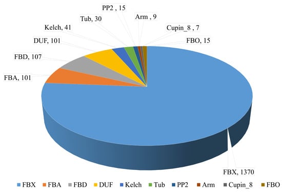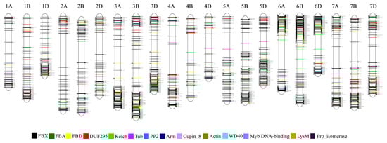 A total of 4363 putative F-box genes were identified by HMM profiling F-box proteins against the local protein database of the wheat genome using the HMMER3 tool. The putative F-box genes were re-examined to identify those with an FBX domain, whereas genes with redundant sequences were removed using the SMART tool and Pfam analysis. A total of 1796 F-box genes containing an FBX domain were selected for further study (Table S2). The F-box genes were classified into 10 subgroups containing an FBX domain and other specific functional domains. Genes containing only one FBX domain in the N-terminal of the peptide sequence were the most abundant gene subgroup of the wheat genome (1370 genes). The groups of other F-box genes are referred to as FBA, FBD, DUF295, Kelch, Tub, PP2, Arm, and Cupin_8. Each of these subgroups contained FBX domains in the N-terminal and one or more known functional domains in the C-terminal of the peptide sequences. The FBA, FBD, DUF295, Kelch, Tub, PP2, Arm, and Cupin_8 subgroups contained 101, 107, 101, 41, 30, 15, 9, and 7 F-box genes, respectively, in the wheat genome. Fifteen F-box genes containing a small number of other specific domains (FBOs) were classified according to the functional domains, which included actin, LysM, Myb-binding, pro-isomerase, and WD40 (Figure 1 and Table S2).